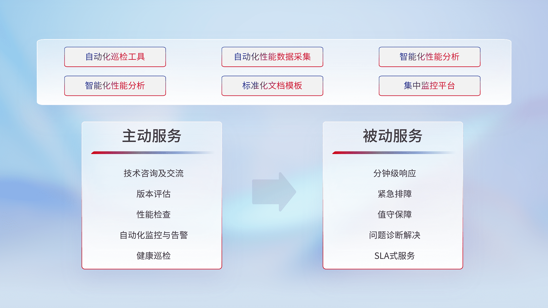 智能化工具和标准化文档,,保障服务质量,,,提供主动服务(包含技术咨询、、版本评估、、性能检查、、、、自动化监控与告警、、健康巡检)和被动服务包含(分钟级响应、、、紧急排障、、、值守保障、、、问题诊断解决、、SLA服务)。。。。